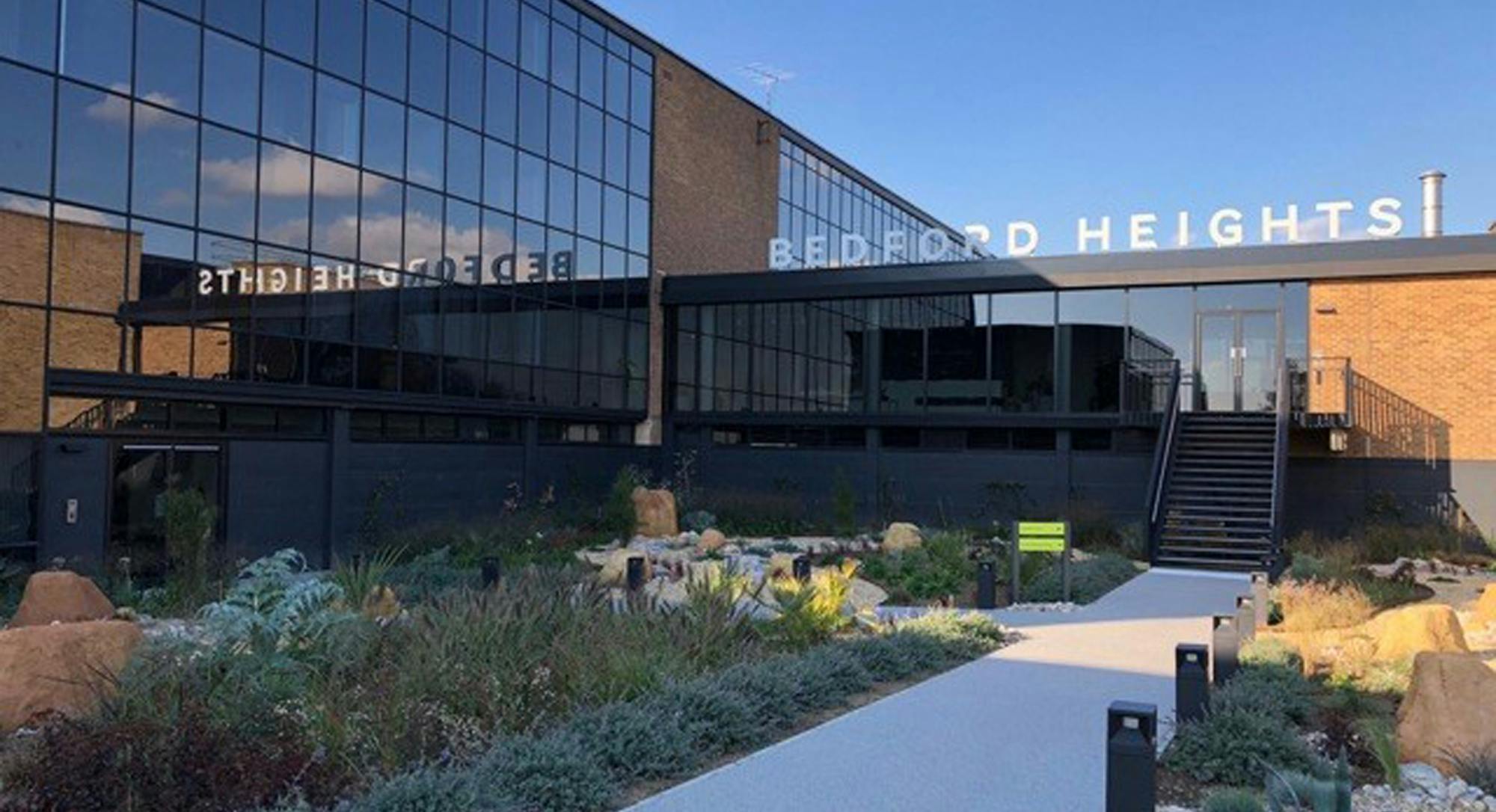 We proposed re-modelling the site levels, raising them by 4 meters to create a new entrance courtyard. The existing plant room was de-commmissioned and the glazed box refurbished to house a contemporary reception area welcoming visitors on their arrival to Bedford Heights. A new DDA-compliant entrance was provided at the lower level, allowing easy access to the new conference suite. The cafe and lounges were refurbished and new wayfinding introduced.