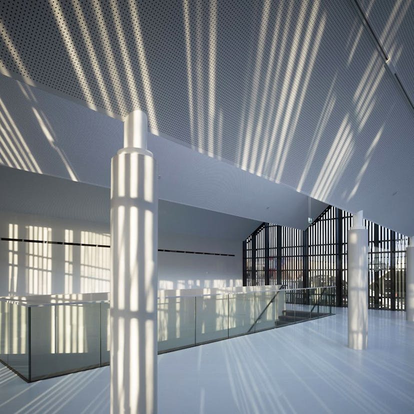 The diagonals of the slopes give an added dynamism to the kaleidoscope of light and shadow radiating from the facade. While the new entrance building has not yet opened, it is already struggling with its size. Too small for a formal routing system and too large to be served by a single counter like a shop, the problem of controlling access to the museum has been left to the exhibition designer.